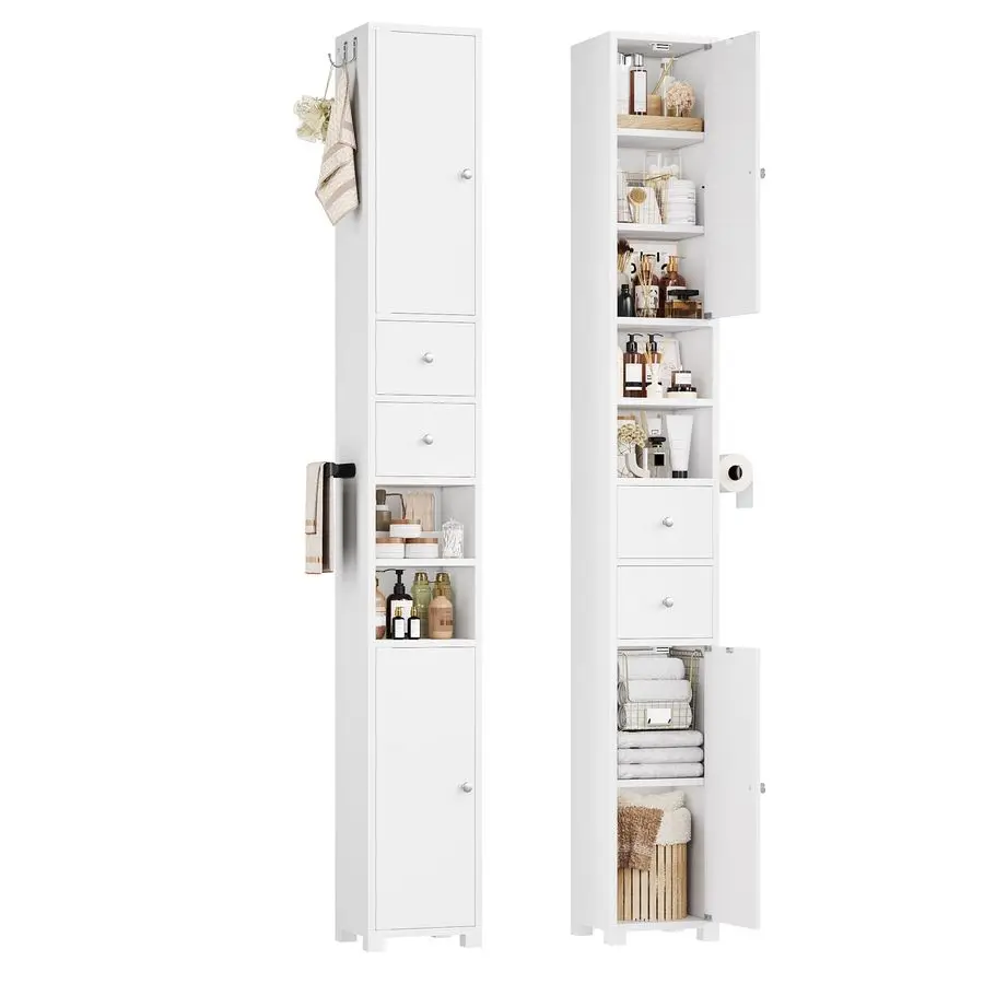 181.5cm Tall Bathroom Cabinet 20cm Slim Bathroom Storage Cabinet Free Standing Narrow Cupboard with Adjustable Shelves, 2 Drawe