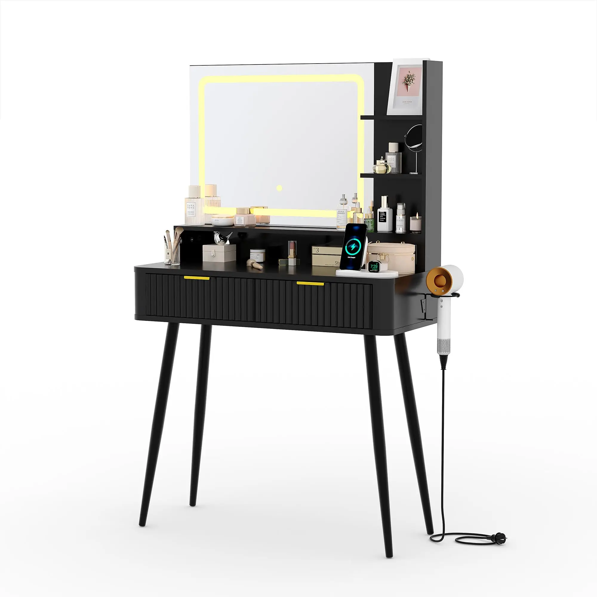31-inch Modern Makeup Vanity Desk with LED Mirror & 3-Color Lights, Fluted Design Dressing Table with Storage Cabinet