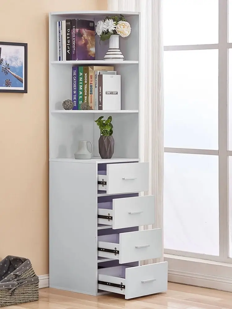 BonChoice Utility 3-Tier Shelves & 4 Drawers Corner Cabinet White for Living Room/Bedroom, Bathroom Corner Storage Cabinet