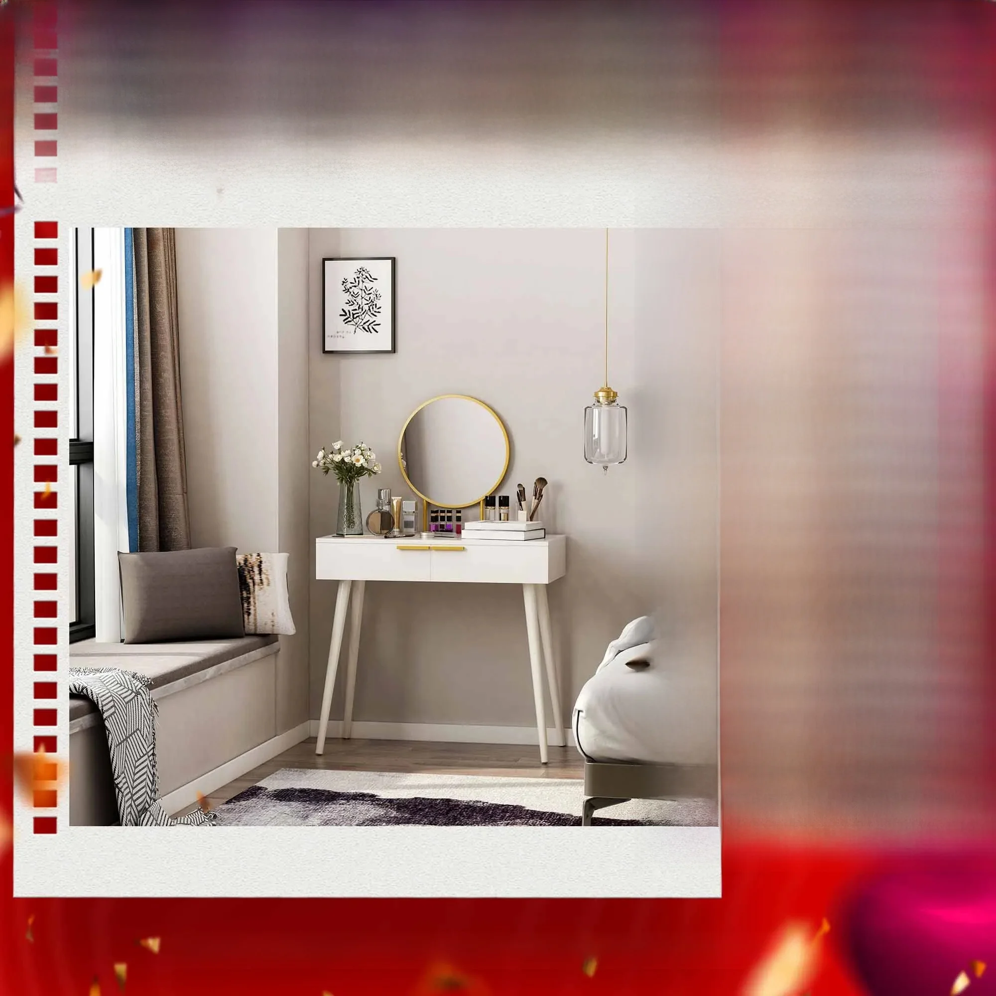 HOMCOM Modern Dressing Table w/ 2 Drawers Round Mirror for Bedroom White