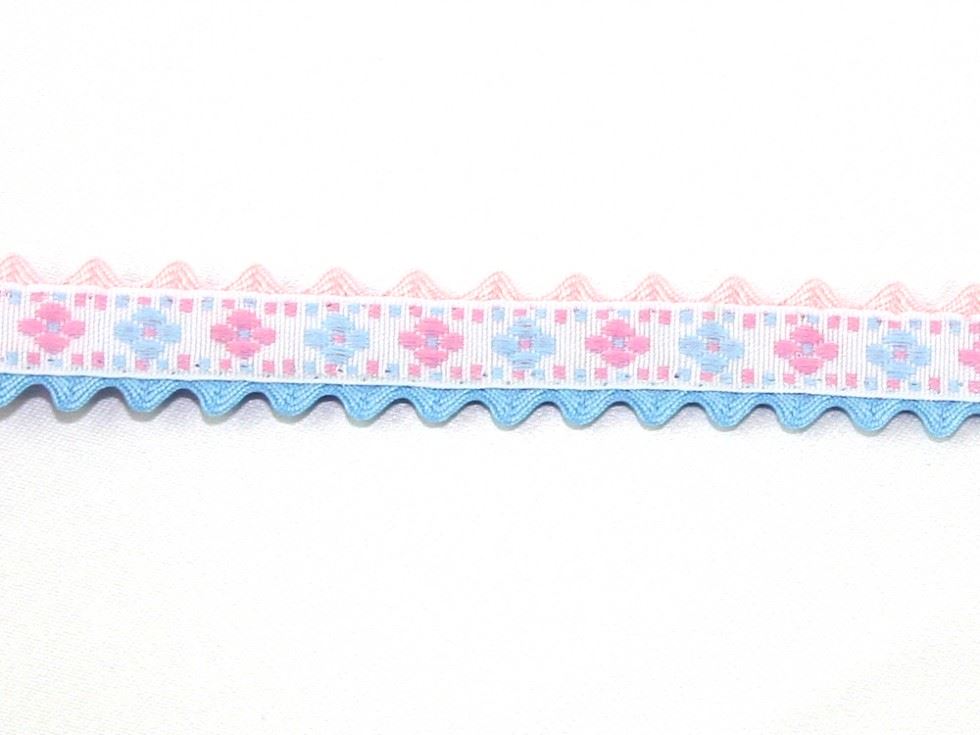 Jacquard trimmings are so beautiful. This lovely woven jacquard is a straight edge ribbon with a floral design. It has a fancy ric rac braid attached down both sides which gives a scalloped effect. It would be lovely to use as an edging on so many of your sewing projects. This braid is available in 4 lovely summery shades!