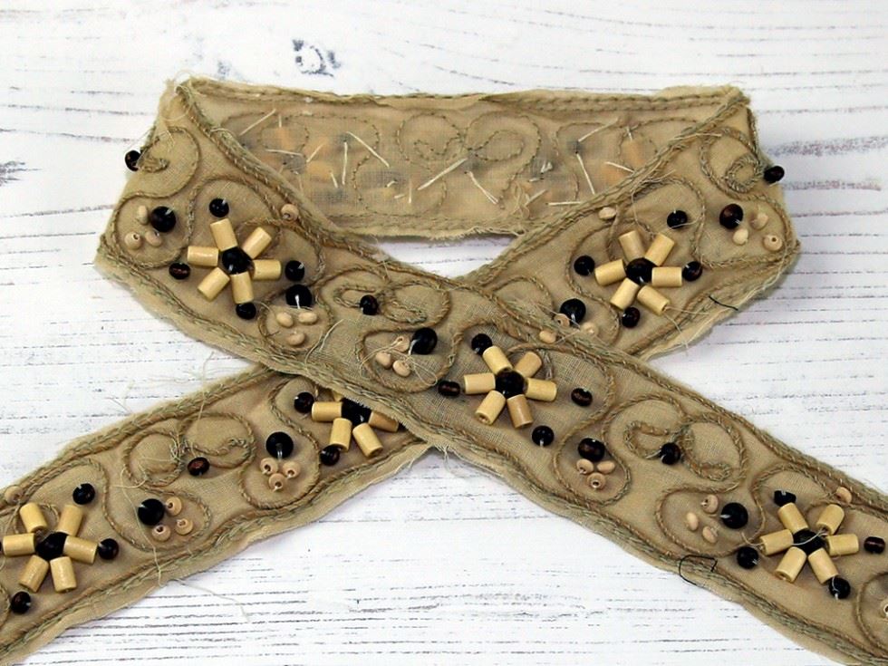 A beautiful quality trimming with a raw, unfinished look. The base of the trim is made from a fine cotton fabric with raw edges. There is then decorative couched embroidery in a natural linen thread which is then further embellished with wooden beads.